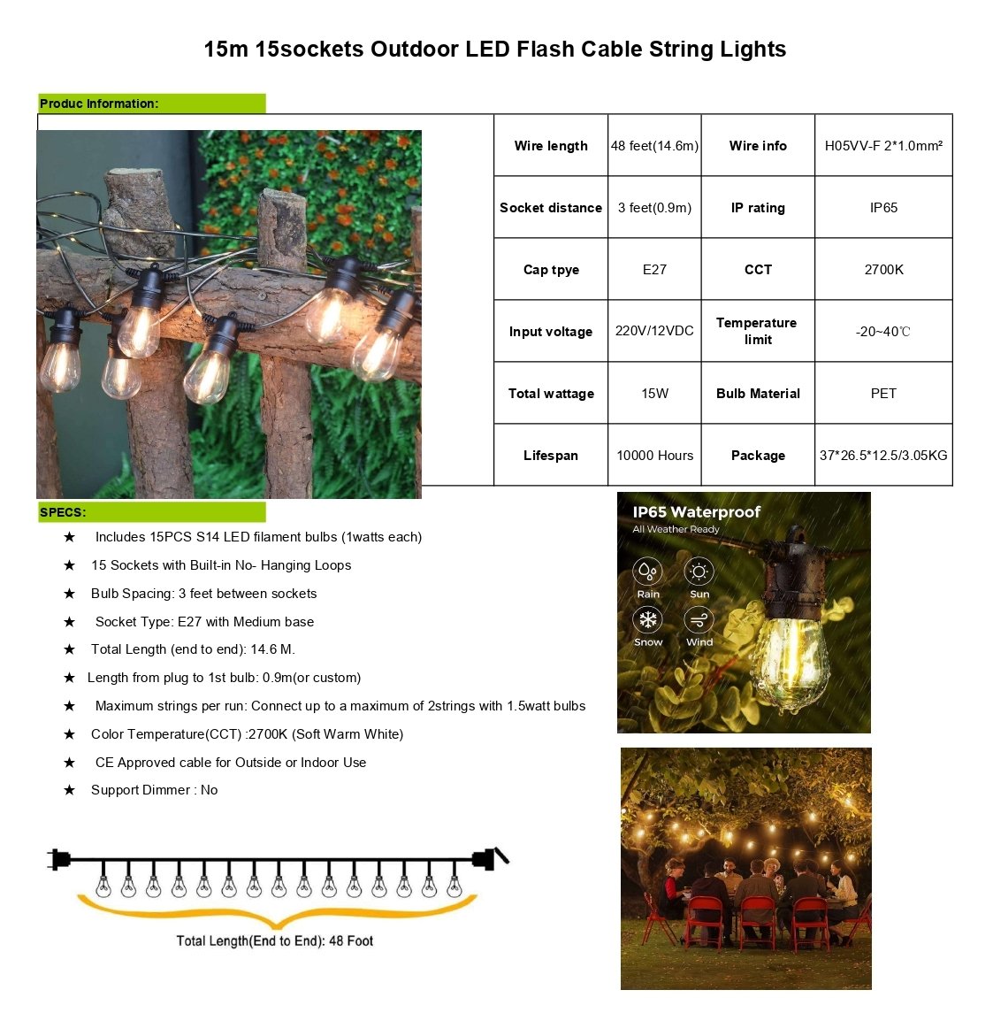ไฟวินเทจ สายไฟแฟลซ 15เมตร15ดวง สายสีวอร์ม หลอดแอลอีดี S14